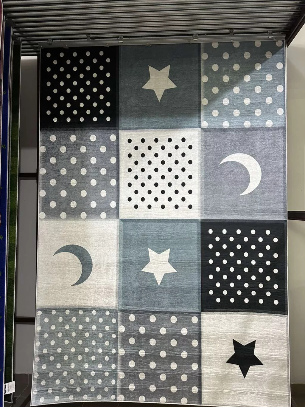 Kék-szürke csillag - és szívmintás gyerekszőnyeg 80x150 cm